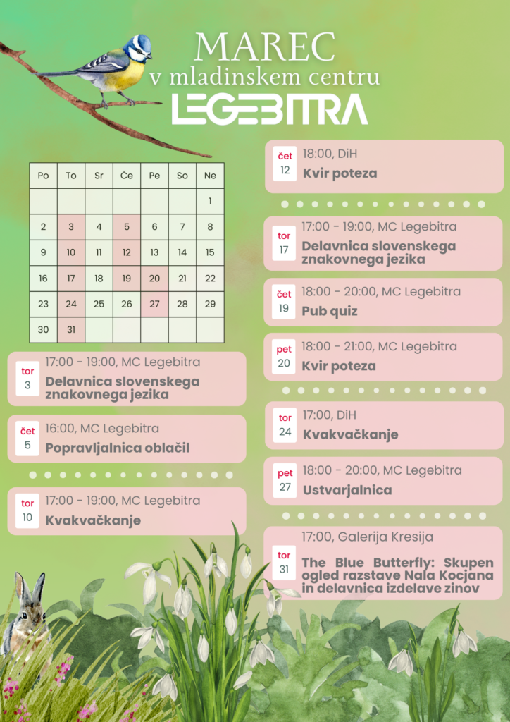 Opis grafik: Grafike je v prijetnih, spomladanskih odtenkih – zelena, turkizna, marelična. Prikazuje akvarelne motive spomladanskega cvetočega travnika in mesečni program v mladinskem centru Legebitra.